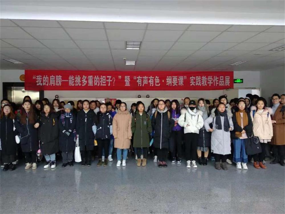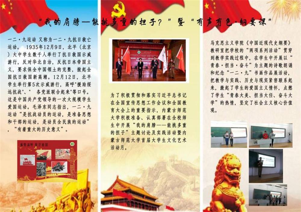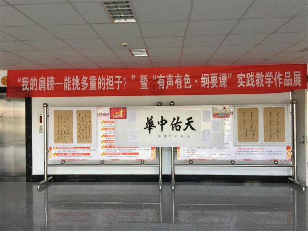 内蒙古师范大学积极贯彻落实习近平总书记在全国宣传工作会议和全国教育大会上的重要指示,在全校师生中开展“我的肩膀——能挑多重的担子?”主题讨论及实践活动暨内蒙古师范大学首届大学生文化艺术节活动月。为了把学校“两项系列活动”贯彻到教学实践中,pp电子官方网站《中国近现代史纲要》教研室在学生中开展了以“青春•担当•奋斗”为主题的诗歌朗诵和以“牢记历史•不忘初心”为主题的“一二•九”书画作品展。经过认真准备、积极部署,共收集学生作品二百余副,包括书法、绘画、雕塑及手工等作品,集中展示在学院楼二楼大厅和学院阅览室,同时由《中国近现代史纲要》课程的齐百顺老师进行现场教学,把教学与实践、历史与现实、爱国与奋斗紧密结合起来,激发了学生的爱国主义情怀,点燃了学生“青春大美•担当大任•奋斗大学”的热情,坚定了社会主义核心价值观。也推动了大学生思想政治课程教学改革的步伐,为打造“有声有色•纲要课”这个教学品牌做出有益的探索。