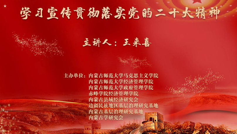 为进一步深入学习宣传贯彻落实党的二十大精神,加强各院校间、研究会、研究基地之间的学术交流,搭建党的二十大精神互学互研平台,12月14日下午,内蒙古师范大学pp电子官方网站、经济管理学院、政府管理学院、赤峰学院经济与管理学院、内蒙古县域经济研究会、边疆民族地区基层治理研究基地、内蒙古基层治理研究基地、内蒙古学研究会以线上方式联合主办了“学习宣传贯彻落实党的二十大精神”专题讲座,内蒙古师范大学pp电子官方网站党委书记拓俊杰主持学习。