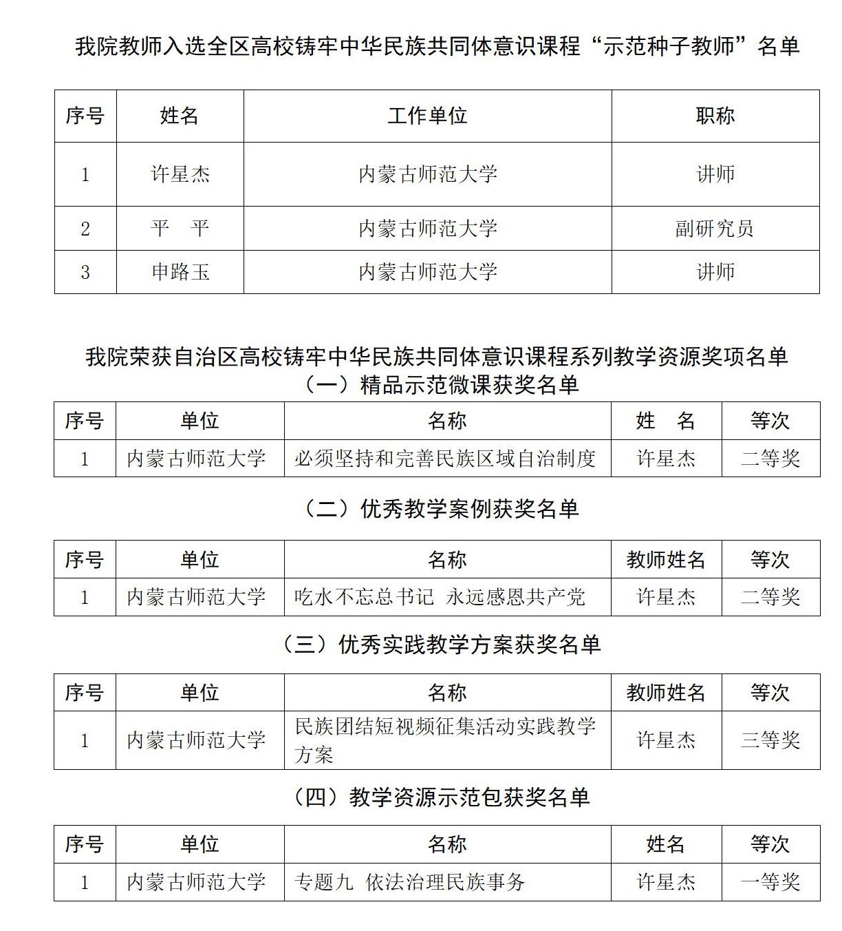 近日,自治区教育厅公布了自治区高校铸牢中华民族共同体意识课程“示范性种子教师”名单和系列教学资源获奖名单,pp电子铸牢中华民族共同体意识课程教研室3位青年教师许星杰、平平、申路玉被评为“示范性种子教师”;许星杰荣获自治区高校铸牢中华民族共同体意识课程系列教学资源奖项4项,包括“教学资源示范包”一等奖、“精品示范微课”二等奖、“优秀教学案例”二等奖和“优秀实践教学方案”三等奖。