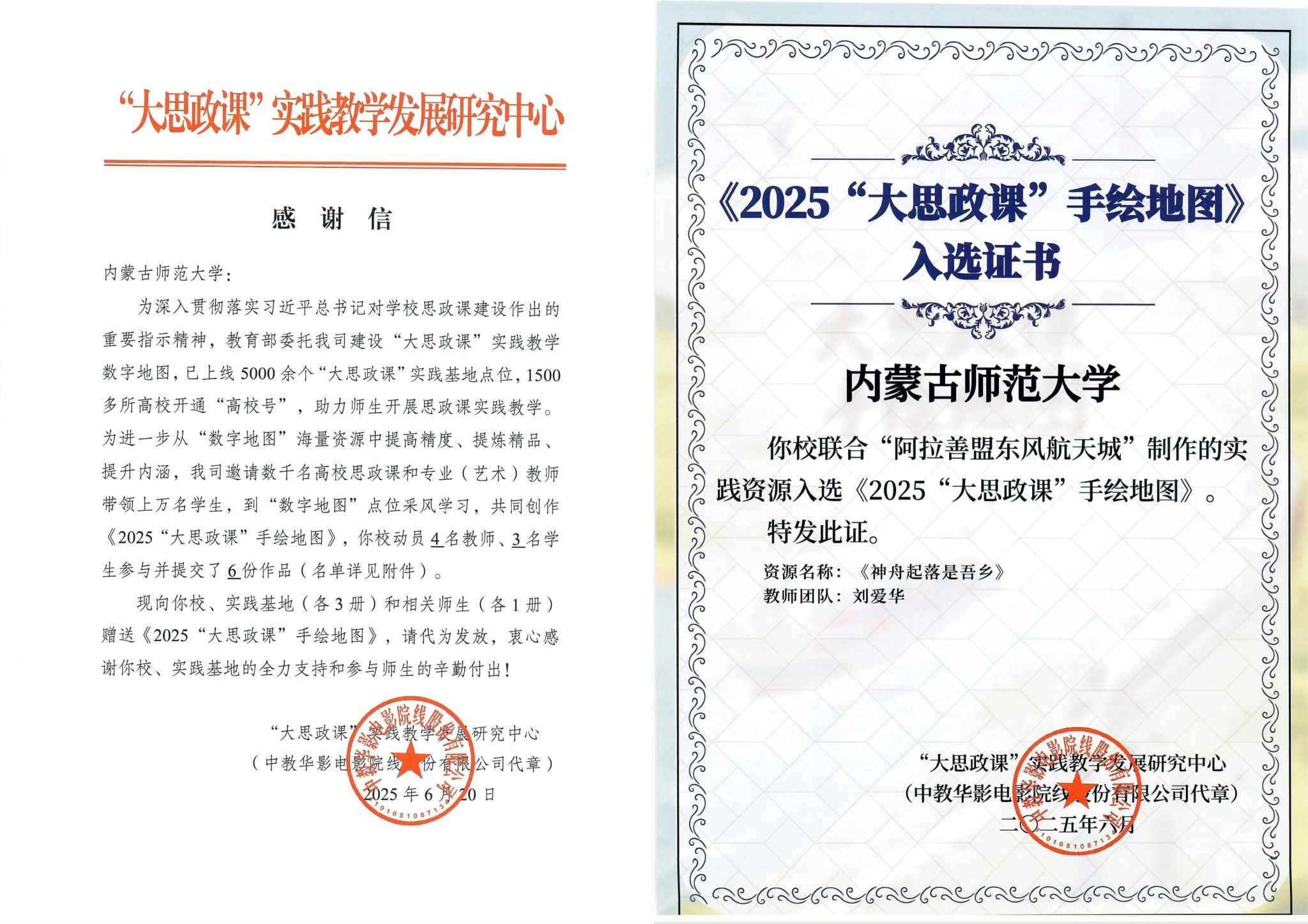 近日,教育部“大思政课”实践教学数字地图项目成果——《2025“大思政课”手绘地图》正式发布。由pp电子刘爱华副院长领衔,联合包头市九原区第三中学曹玥老师及学生团队,携手“阿拉善盟东风航天城”实践基地共同创作的思政实践教学资源成功入选,成为全国1500余所高校中脱颖而出的精品案例,彰显了pp电子在思政课实践育人领域的创新成果。