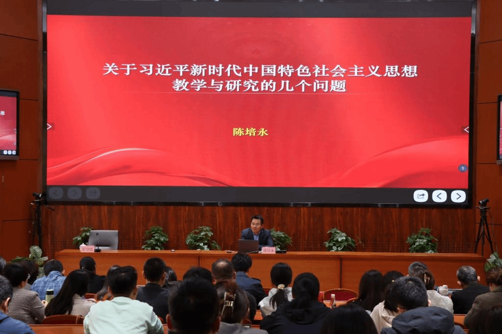 陈培永教授以《关于习近平新时代中国特色社会主义思想教学与研究的几个问题》为题,围绕“习近平新时代中国特色社会主义思想的总体把握”、“教材向教学的转化”、“学术研究理路”三个方面作了详细讲解。陈教授向与会教师分享了自己的思政课教学心得,他认为,教师要突出自身在课堂上的“主体性”,通过“穿插心得”、“讲解观点”、“问题思考”、“打造金句”等多种形式提升课堂教学质量。