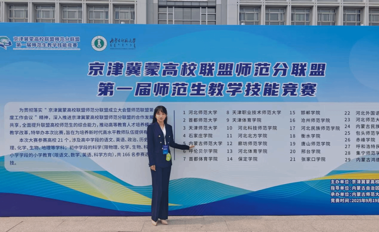 能在京津冀蒙高校联盟师范分联盟首届师范生教学技能竞赛中获一等奖,我倍感荣幸。这份荣誉离不开学院领导的关怀、老师们的指引,尤其要感谢指导老师顾媛媛、许星杰的悉心打磨与无私支持,是你们的帮助让我不断突破。
