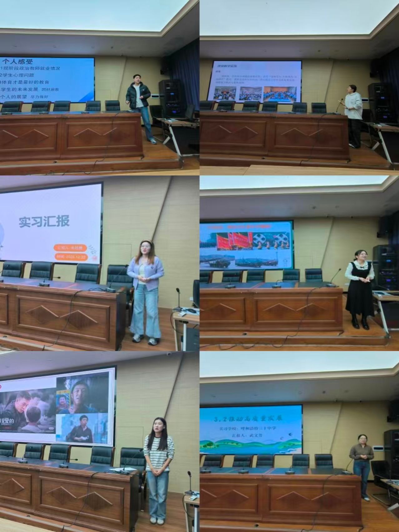 总结大会上,6 名实习生代表依次作实习成果汇报。李玉同学从听课观摩、课堂授课、班主任工作实践等方面,系统分享了在内蒙古师范大学附属第二中学的实习体会与成长感悟;张秀怡同学结合在呼和浩特市第一中学的实习经历,聚焦教学反思展开交流,提出思政课应兼具理论深度与情感温度的核心观点;朱若晨同学详细介绍了在实验中学鼓楼校区参与集体备课、教研研讨及主题班会组织等多元实践的收获与思考;赵亚芹、刘阳、武文芳三位同学分别围绕 “自强不息”“公民基本权利”“新发展理念” 主题进行教学片段展示,充分展现出扎实的教学设计功底与娴熟的课堂实践能力。