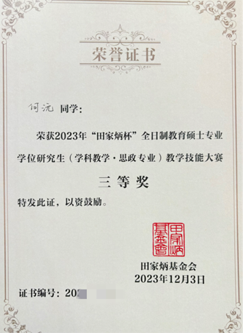 本次比赛共有来自华中师范大学、山东师范大学、上海师范大学等全国75所院校的188名选手入围决赛。决赛赛程分为:现场抽题、限时备课、授课答辩三个环节。经过激烈角逐,在刘爱华副院长和乌晓晔副教授的精心指导下,pp电子2022级学科教学(思政)专业硕士研究生何沅获得三等奖。
