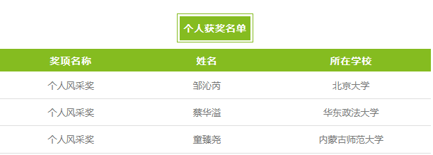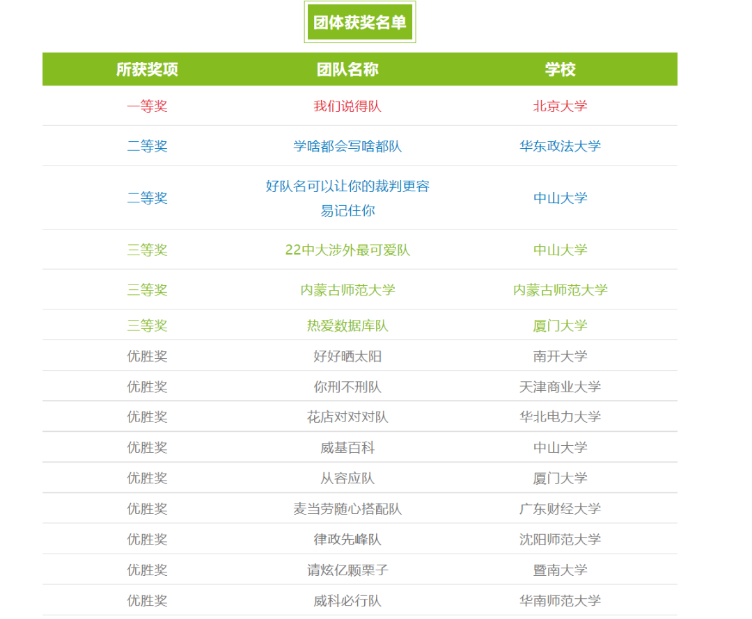 经过激烈比拼,在核算四轮综合得分后,大赛桂冠花落北京大学“我们说得队”。亚军被来自华东政法大学的“学啥都会写啥都队”和来自中山大学的“好队名可以让你的裁判更容易记住你”队揽获。来自中山大学的“22中大涉外最可爱队”、内蒙古师范大学的“内蒙古师范大学队”及来自厦门大学的“热爱数据库队”则获得季军殊荣。