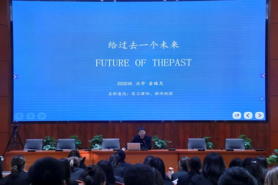 2020级法学二班童臻尧同学以“给过去一个未来”为题,向大家介绍了自己的工作经历、以及自己实习的经验和主要的求职意向,同时展示了自己所获的诸多奖项荣誉以及社会实践成果。他提出三年的努力,能够让自己有巨大的改变,同时也会为社会做出不同方面的贡献。