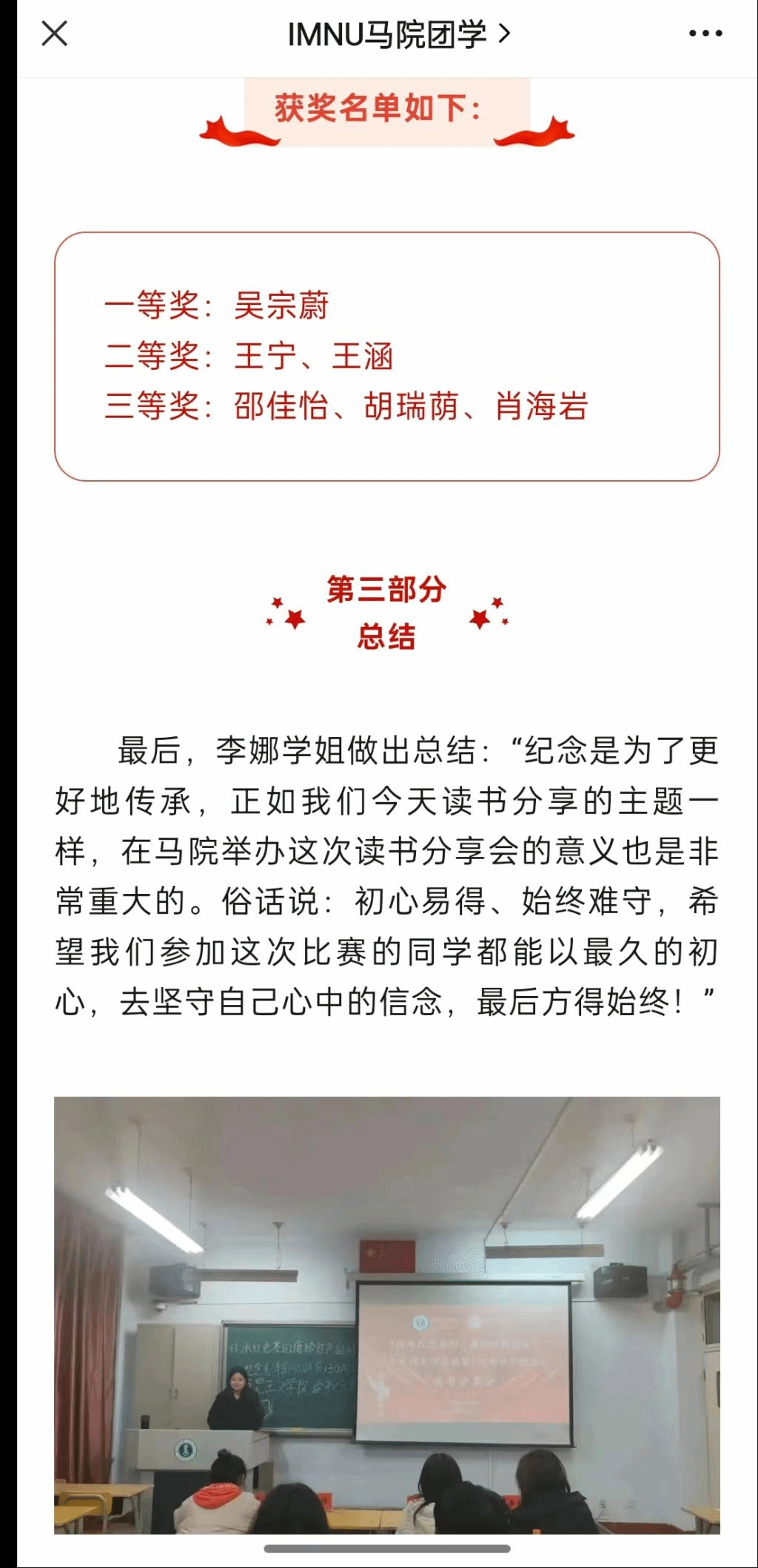 (五)内蒙古师范大学pp电子官方网站纪念毛泽东诞辰130周年读书分享会中我班王涵和王宁同学荣获院级二等奖