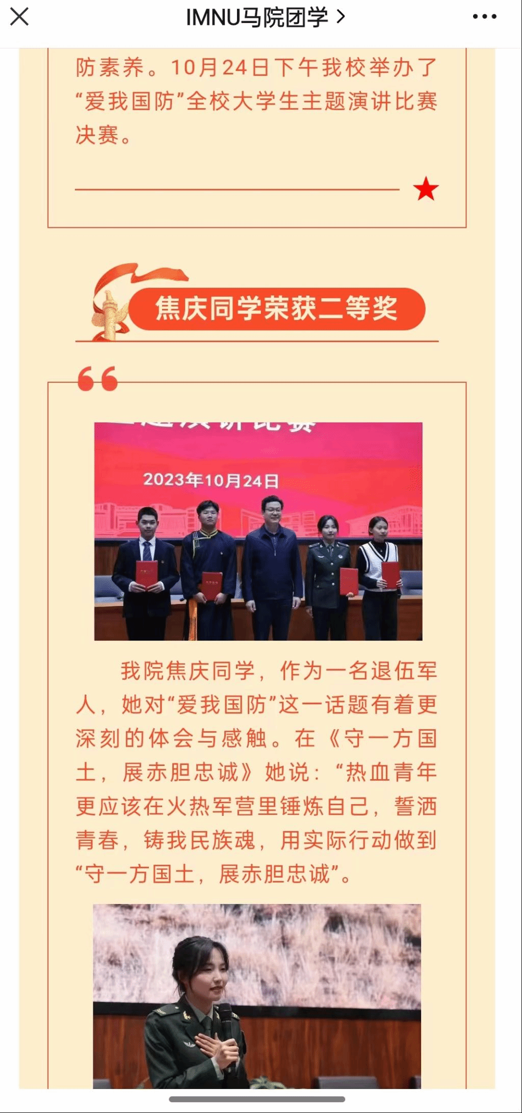 (三)内蒙古师范大学“爱我国防”全校大学生主题演讲决赛中我班焦庆同学荣获校级二等奖,