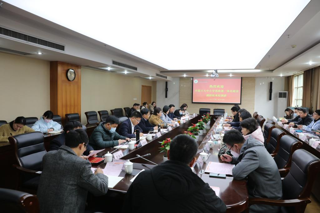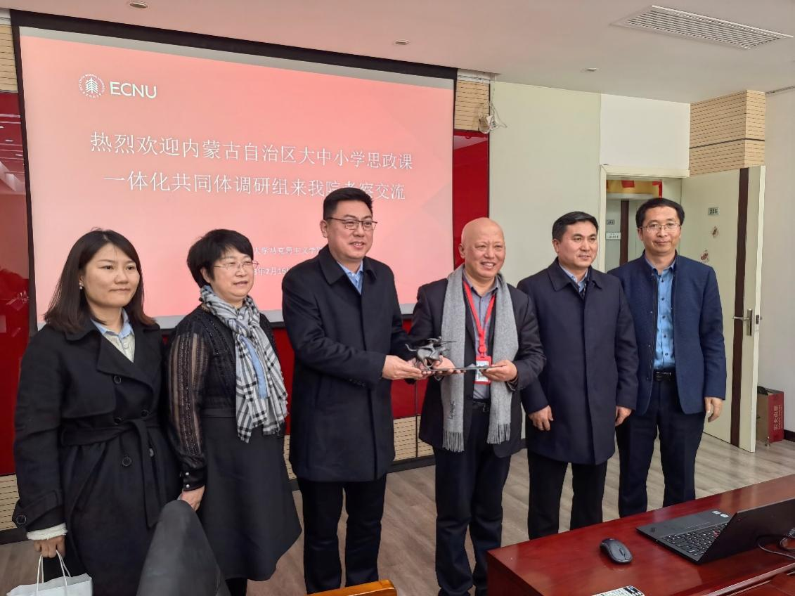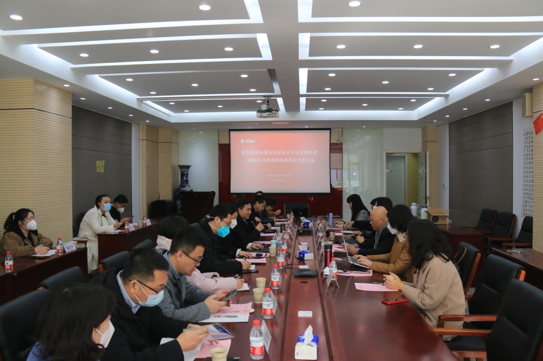 2月16日上午,调研组一行来到华东师范大学闵行校区,华东师范大学pp电子官方网站党委书记赵正桥等人带领调研组参观了华东师范大学党建服务中心、社会主义历史与文献研究院和大中小学思政课一体化教材成果展列室。随后,在座谈会上,自治区教育厅学生处处长王勇代表调研组介绍了本次调研目的及内蒙古自治区大中小学思政课一体化共同体建设情况。上海市教委德育处处长朱敏、华东师范大学pp电子官方网站党委书记赵正桥、副院长许瑞芳等人就上海市及华东师范大学大中小学思政课一体化共同体建设情况与调研组成员进行了深入交流,着重介绍了课程教学一体化、师资培养培训一体化以及体制机制一体化等方面的典型做法、取得的成效及下一步建设的思路和方向。